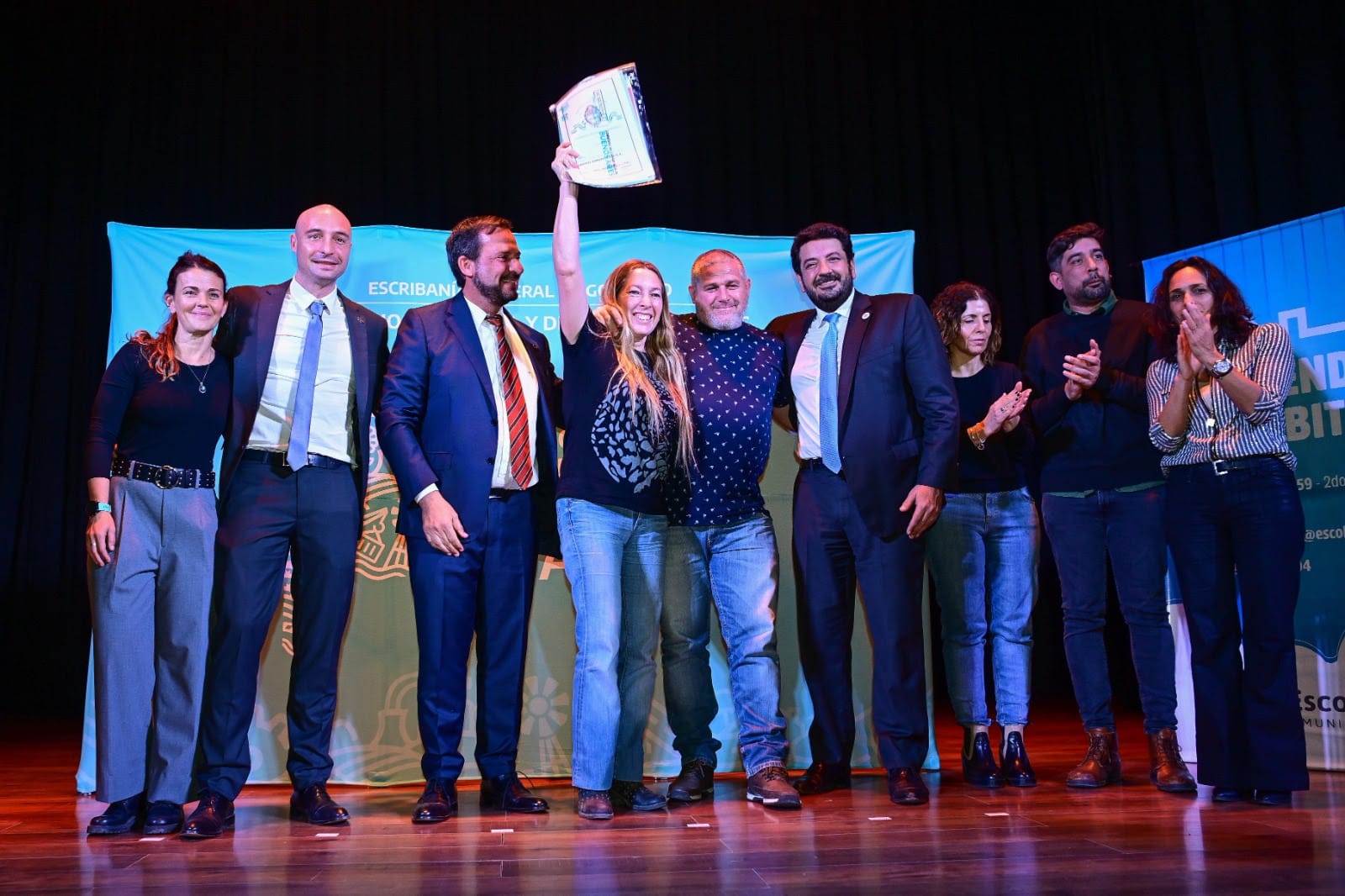 El intendente Ariel Sujarchuk, junto al ministro de Justicia y Derechos Humanos de la Provincia, Juan Martín Mena, entregó 146 escrituras sociales a vecinos y vecinas del distrito en un acto público que se realizó en el Teatro Seminari de Belén de Escobar.