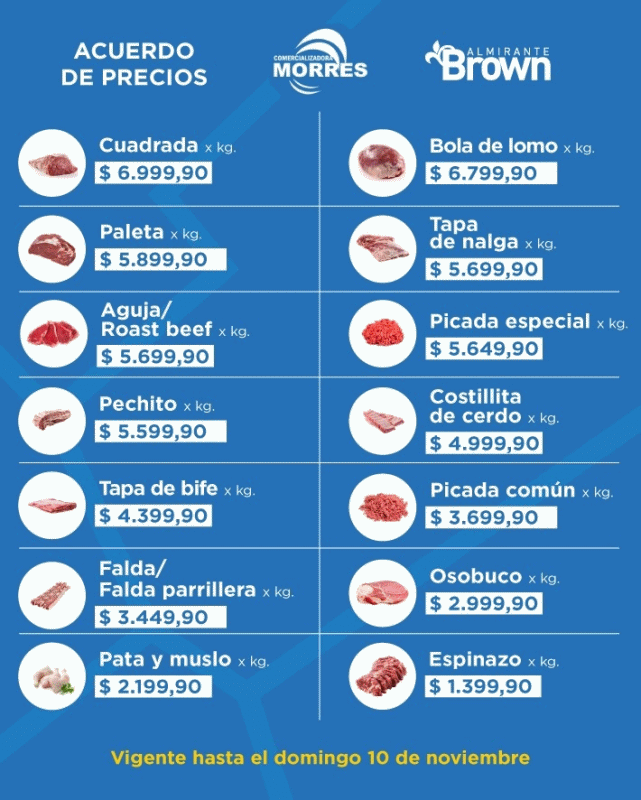 El Municipio de Almirante Brown destacó que a merced al Acuerdo de Precios que mantiene con dos frigoríficos de nuestra región, se renuevan las ofertas en una amplia variedad cortes de carne muy convenientes para la economía de las familias de nuestro distrito.
