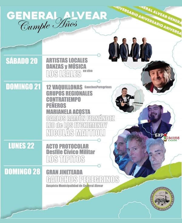 El municipio de General Alvear llevará a cabo un megafestejo que se realizará durante los días 20, 21 y 22 con desfile, bailes típicos, artesanos, peñas y música en vivo. El evento exhibirá en el palco mayor a artistas de renombre como “Los Leales” que serán los encargados de musicalizar la noche del sábado. El domingo será el momento de Marianela Acosta, el reconocido Carlos Ramón Fernández, Los Etchemendy y cerrará Nicolás Mattioli (hijo del reconocido Leo Mattioli). El lunes se llevará a cabo el acto protocolar-desfile cívico militar cerrando este gran encuentro de la mano de Los Tipitos a puro baile.