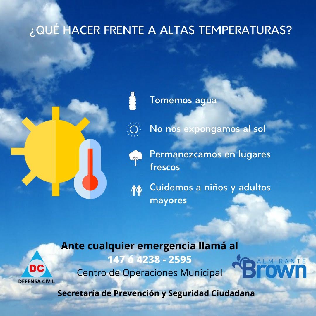 El Municipio de Almirante Brown difundió una serie de recomendaciones ante las temperaturas extremas de calor pronosticadas para estos días por el Servicio Meteorológico Nacional en nuestra región y el AMBA en general. El objetivo es evitar golpes de calor y cuidar la salud de los vecinos, especialmente de los adultos mayores y los niños.