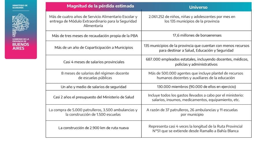 Entre las comparaciones realizadas afirmó que la magnitud de la pérdida estimada equivale a ocho meses de salarios docentes, más de 4 años del Servicio Alimentario Escolar (SAE) más de un año de coparticipación a los municipios, 4 meses de pago de salarios provinciales, dos años del presupuesto provincial en salud, la compra de 5 mil patrulleros, 3500 ambulancias, la construcción de 1500 escuelas o de casi 3 mil kilómetros de ruta nueva.