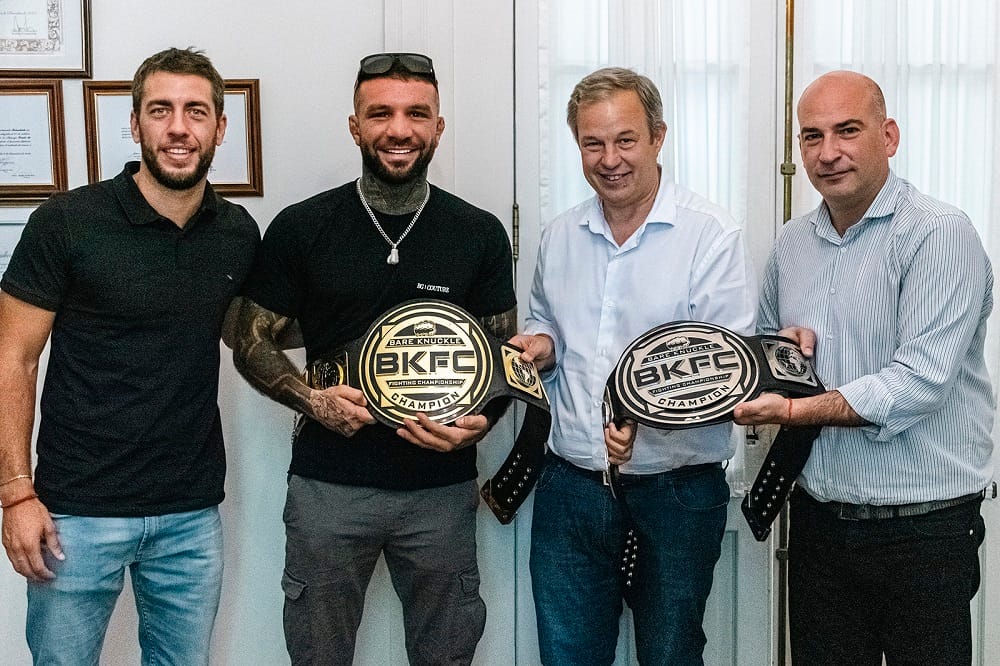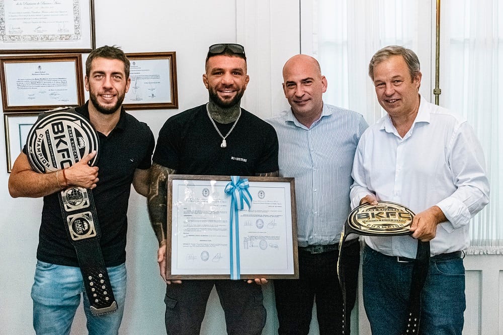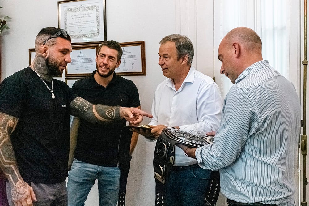 El intendente de Almirante Brown, Mariano Cascallares, entregó a Franco Tenaglia, artista marcial mixto y campeón mundial de boxeo a puño limpio oriundo de Burzaco, un reconocimiento que lo declara como “Personalidad Destacada del Deporte” en nuestro distrito.