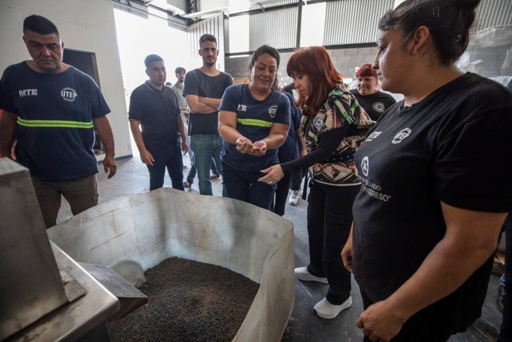 Cristina dijo que el Eco Punto es “un proyecto cooperativo de cuidado del ambiente, generación de trabajo genuino y un ejemplo de economía circular», y que allí conversó con recicladoras y recicladores que le contaron «cómo están sufriendo el impacto de las políticas de Milei; tanto por la caída del precio del cartón a partir de la apertura indiscriminada de las importaciones, que en tres meses bajó de $200 a $100 el kilo, como por la disminución en los volúmenes de cartón por la brutal caída del consumo”.