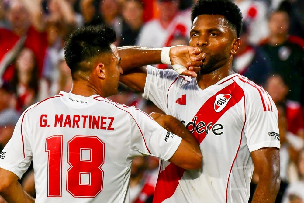 Nuevamente Mastantuono, la gran figura que ingresó desde el banco, recibió una pelota en el área, la perdió con la defensa pero la recuperó y asistió al colombiano Borja, quien de cabeza por el segundo palo convirtió el 2 a 0 de River a los 30 minutos del segundo tiempo.