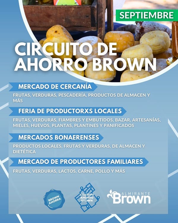Durante el presente mes de septiembre vuelve el “Circuito de Ahorro en Brown” con numerosas alternativas de mercado para que las vecinas y vecinos de nuestro distrito puedan adquirir productos regionales a precios accesibles.