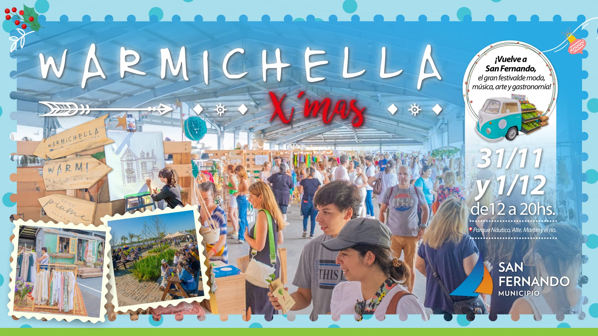 En el Parque Náutico de Almirante Martin y el Río, de 12 a 20 hs. San Fernando recibirá a la edición Xmas del festival itinerante de moda, decoración y arte, con foodtrucks, alimentos saludables y música en vivo. Habrá variedad de stands, artes visuales y más sorpresas, con entrada libre y gratuita. Los emprendedores sanfernandinos pueden participar, inscribiéndose hasta el 15 de noviembre en https://sanfernando.gob.ar/warmichella2024