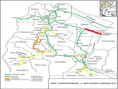 • Belgrano Cargas S.A. (7.347 km), que comunica Buenos Aires con Rosario, Santa Fe, Córdoba, Resistencia, Salta, Jujuy, Tucumán, Catamarca, San Juan y Mendoza, y la localidad de Salta con Formosa.
