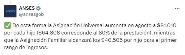El incremento también se aplicará a las jubilaciones y otras prestaciones sociales. De esta manera, en agosto, la AUH alcanzará la suma de $81.080; la AUH por Hijo con Discapacidad se ubicará en los $263.791, y la Asignación Familiar por Hijo, $40.505 para el primer rango de ingresos.