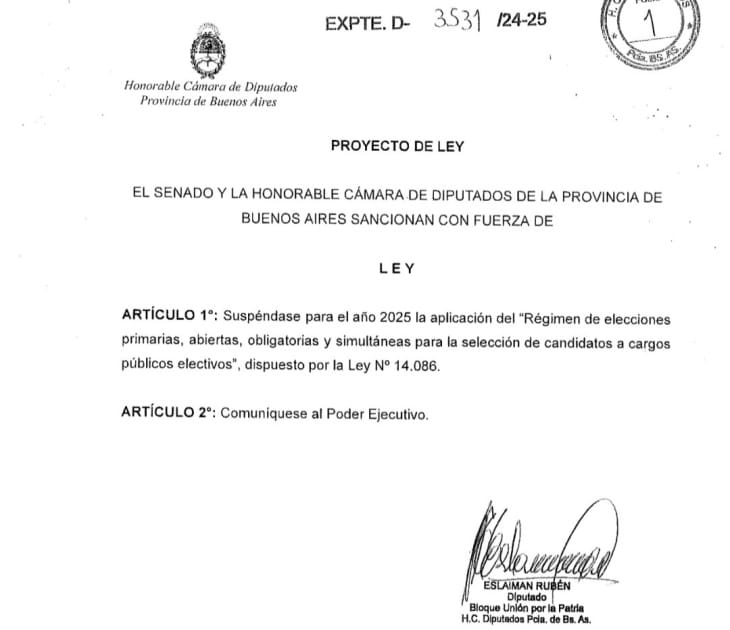 “Suspéndase para el año 2025 la aplicación del régimen de elecciones primarias, abiertas, simultáneas y obligatorias para la elección de candidatos a cargos públicos electivos, dispuesto por la Ley 14.086”, reza la iniciativa impulsada por el legislador Ruben Eslaiman, hombre de extrema confianza de Sergio Massa.