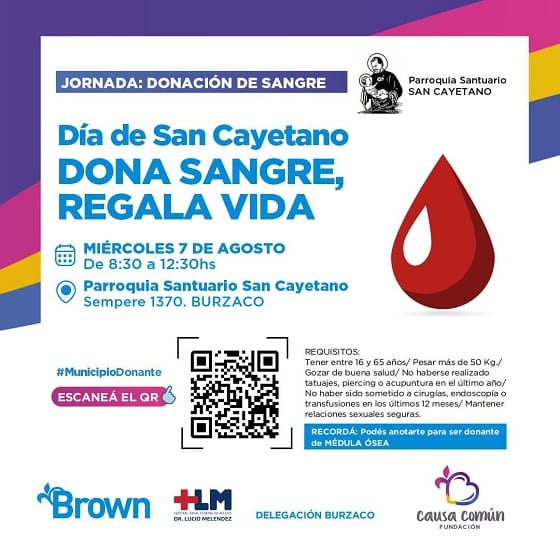 El Municipio de Almirante Brown, a través de la Fundación Causa Común, informó que llevará adelante el miércoles 7 de agosto una nueva jornada de donación de sangre en el marco del Día de San Cayetano, patrono del pan y del trabajo, en la localidad de Burzaco.