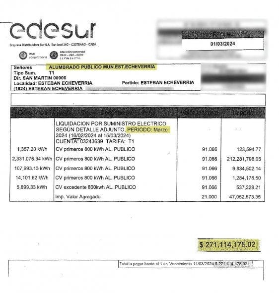 El intendente, Fernando Gray, hizo público el valor de la factura de luz que su municipio recibió por el mes de febrero. El monto es de $271.114.175 contra $71.882.479 del mes anterior. Representa un incremento del 382%.