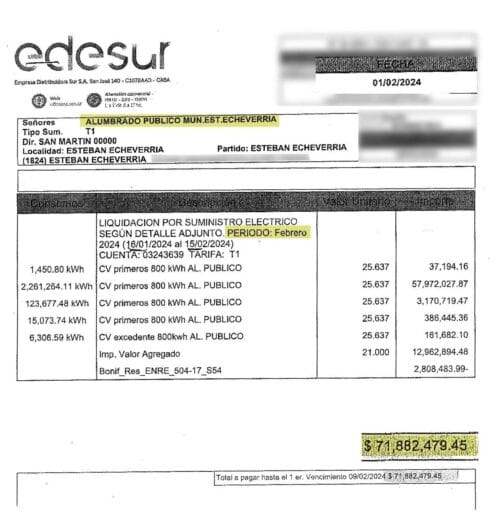 El incremento representa un 382% con respecto al mes anterior. El jefe comunal, Fernando Gray, presentó un reclamo ante Edesur y el Ente Regulador.