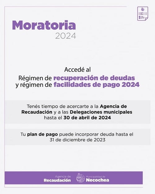 En el marco del Régimen de Recuperación de Deuda y Facilidades de Pago, el Ejecutivo a cargo de Arturo Rojas lanzó una moratoria que se extiende hasta el 30 de abril de 2024. Así lo anunció la Agencia de Recaudación Municipal de Necochea