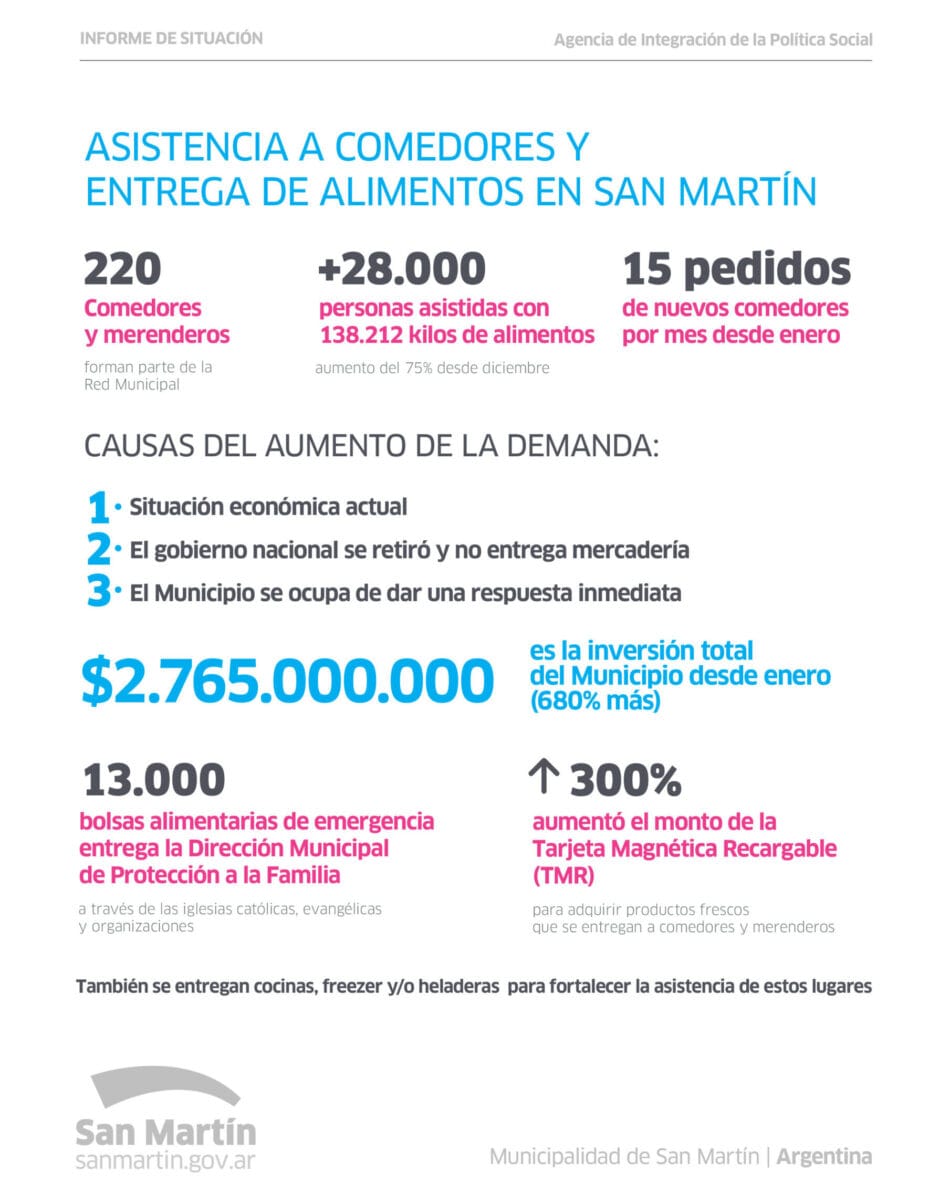 El Municipio de San Martín amplió de 180 a 220 la cantidad de comedores y merenderos a los que asiste con alimentos, tras el fuerte aumento de la demanda que estos espacios registran desde diciembre y los pedidos de nuevos comedores, que ascienden a 15 por mes desde enero.