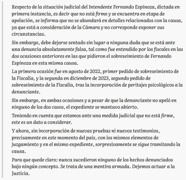 Espinoza rechazó los cargos en su contra. Desde la comuna se remarcó que es un fallo que “no está firme y se encuentra en etapa de apelación”, en un comunicado dado a conocer a la prensa.