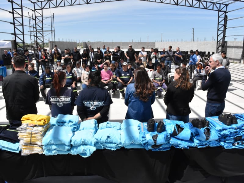 En la mañana de hoy, el intendente de Berisso Fabián Cagliardi, acompañado por la Subsecretaria de Residuos Sólidos Urbanos y Economía Circular del Ministerio de Ambiente de la provincia de Buenos Aires, Jackie Flores, encabezó el acto de entrega de ropa, que incluyó calzado, camperas, buzos, pilotos de lluvia y herramientas de trabajo, como contenedores, 10 carros, maquinarias y elementos en general para la cooperativa de Recuperadores Urbanos de Berisso.