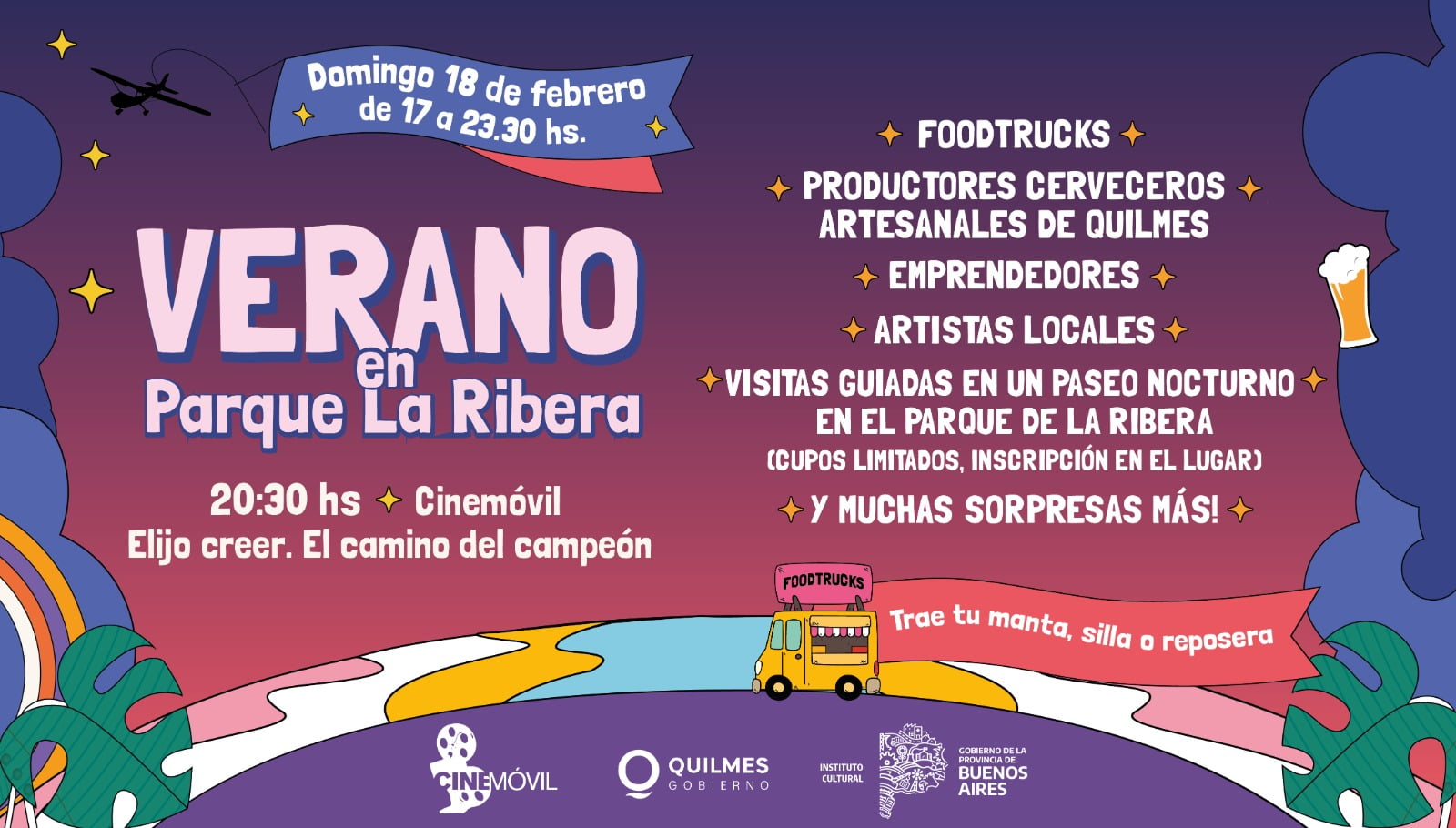 El Municipio de Quilmes invita a los vecinos y vecinas a disfrutar de una nueva jornada del verano en el Parque de La Ribera, que tendrá lugar este domingo 18 de febrero, de 17 a 23.30, en el imponente espacio ubicado en las avenidas Otamendi y Cervantes, sobre las costas del Río de la Plata, donde habrá un cine móvil en el cual a las 20.30, se proyectará la película “Elijo Creer”, para revivir el campeonato del mundo ganado por la Selección en Catar, entre otras actividades culturales, artísticas y gastronómicas disponibles para las familias.