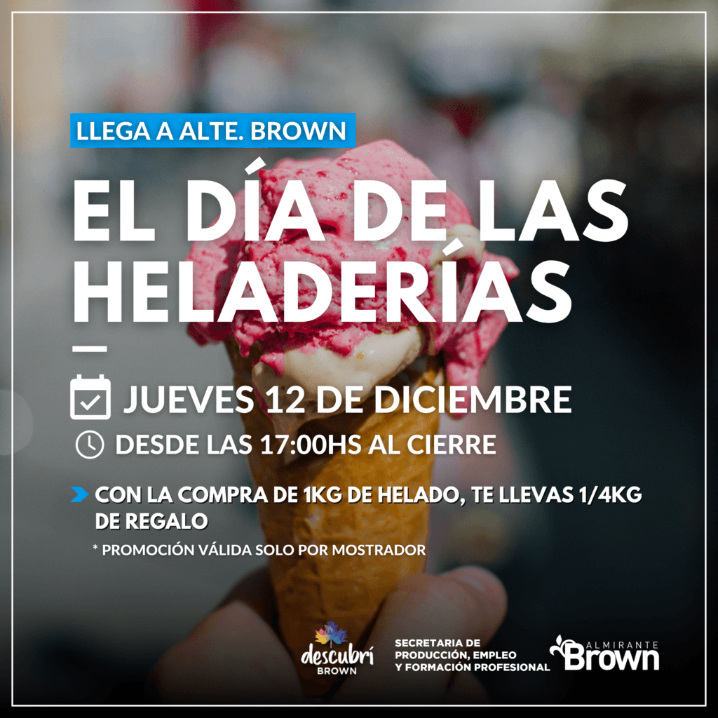 El Municipio de Almirante Brown anunció que este jueves 12 de diciembre llega a Almirante Brown el “Día de las Heladerías”, con los más deliciosos sabores y una promoción especial para todos los vecinos de nuestro distrito.