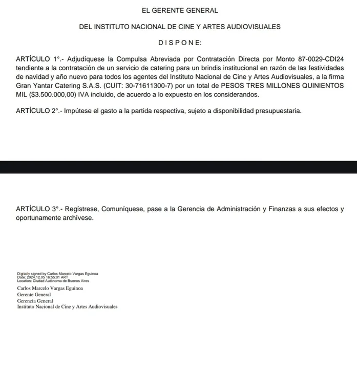 El pasado 17 de diciembre de 2024, el Instituto Nacional de Cine y Artes Audiovisuales (INCAA) celebró su fiesta de fin de año en el Cine Gaumont, a la cual destinó $3.500.000 para el catering del evento. La contratación, realizada mediante el expediente EX-2024-122372247- -APN-GAYF#INCAA, fue adjudicada a la firma Gran Yantar Catering S.A.S., y aprobada por el gerente del organismo, Carlos Marcelo Vargas Eguinoa.