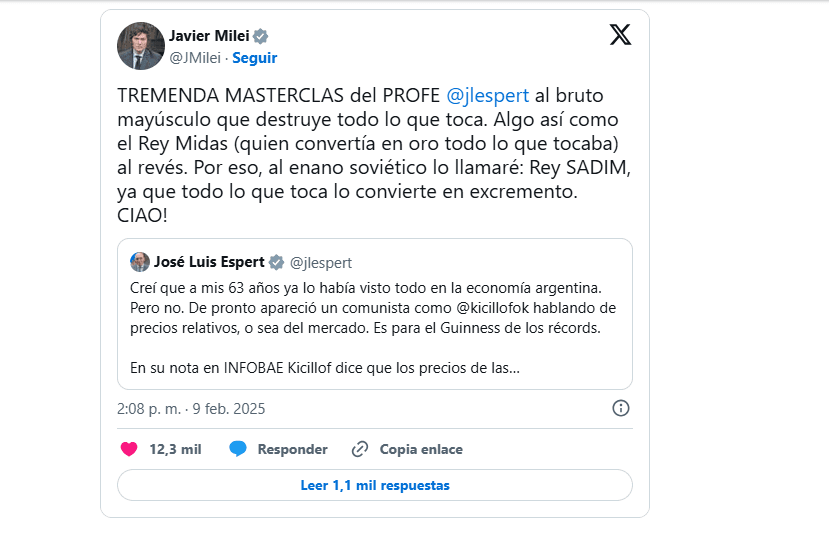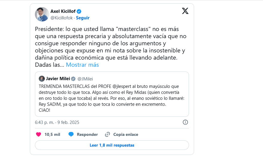 “Dadas las dificultades de comprensión que manifiestan ambos, y la mezcla de pereza intelectual y fanatismo ideológico que también exhiben, voy a ser aún más claro: la política económica que usted festeja como exitosa está pulverizando jubilaciones, salarios, empleo, a la industria y la producción nacional. Está generando más desigualdad social, más violencia y, sobre todo, está rifando el futuro de los argentinos”, enumeró.
