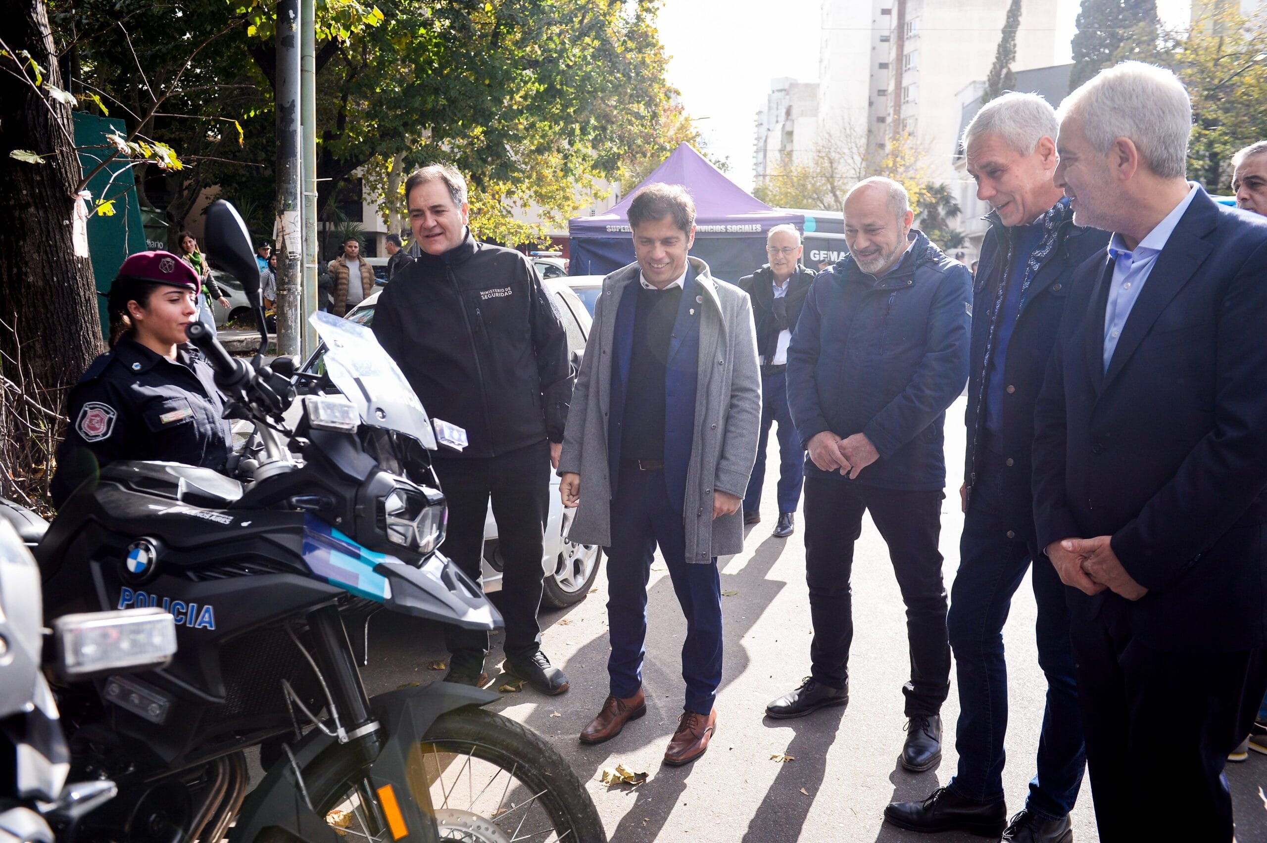 A continuación, Kicillof efectuó la entrega de equipamiento y vehículos para el fortalecimiento de la seguridad en la región capital, junto al ministro de Seguridad, Javier Alonso, y los intendentes de La Plata, Julio Alak; de Ensenada, Mario Secco; y de Berisso, Fabián Cagliardi. En el marco del nuevo sistema de patrullaje integrado que impulsó Alak, estos distritos serán dotados de 70 motos, cinco móviles, un vehículo para escenas del crimen y una morguera.