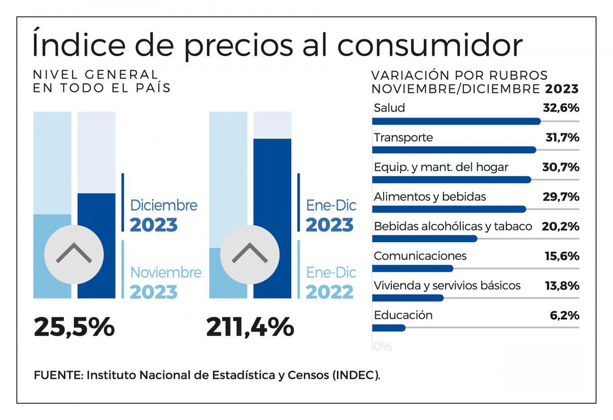 Los precios al consumidor (#IPC) aumentaron 25,5% en diciembre de 2023 respecto de noviembre y 211,4% interanual https://t.co/IG1SNtsCdg pic.twitter.com/NNuXVve3Gk— INDEC Argentina (@INDECArgentina) January 11, 2024