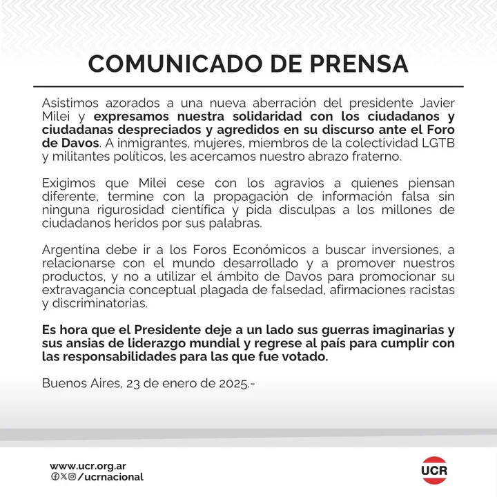 “Asistimos azorados a una nueva aberración del presidente Javier Milei y expresamos nuestra solidaridad con los ciudadanos y ciudadanas despreciados y agredidos en su discurso ante el Foro de Davos. A inmigrantes, mujeres, miembros de la colectividad LGBT y militantes políticos, les acercamos nuestro abrazo fraterno”, reza el comunicado en su inicio.