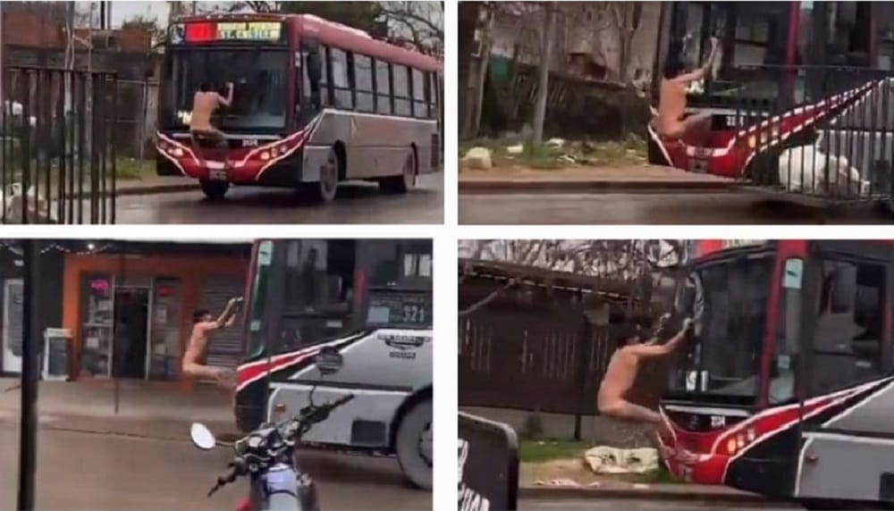 El hecho ocurrió en la intersección de las calles Hornos y Donofrio. El interno 3134 de la mencionada línea de colectivos circulaba con el hombre desnudo colgado del limpiaparabrisas, mientras el chofer continuaba recogiendo pasajeros como si nada inusual estuviera sucediendo.