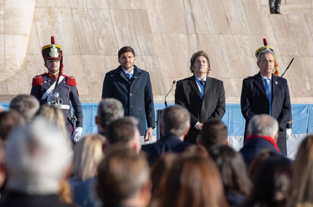 El Presidente encabezó el acto por el Día de la Bandera acompañado por su Gabinete y el gobernador de Santa Fe, Maximiliano Pullaro, quien le reclamó fondos para las provincias.