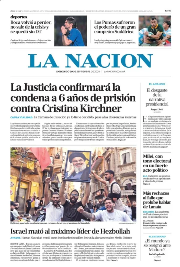 Según consta en la edición del pasado domingo, la Cámara de Casación se pronunciaría esta semana y confirmaría la condena de primera instancia. La sala de Casación interviniente, de dudosa imparcialidad, está integrada por magistrados con vínculos fluidos con Mauricio Macri (como los jueces Mariano Borinsky y Gustavo Hornos). Haber hecho trascender la noticia es una provocación evidente y un acto fuera de todo respeto por las garantías procesales, puesto que la afectada ni siquiera ha sido notificada de tal resolución. Pero además, la oportunidad de la publicación sugiere que los jueces responden al presidente de la Nación, ya que unas horas antes de la tapa del diario, en el marco de un acto partidario, Milei “apura” en su discurso a los jueces para que avancen en las causas contra Cristina Fernández de Kirchner.