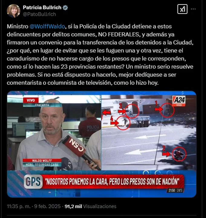 La ministra de Seguridad de la Nación, Patricia Bullrich, cuestionó duramente al ministro de Seguridad de la Ciudad, Waldo Wolff, luego de sus declaraciones sobre la fuga de seis presos de la Comisaría Vecinal 6 A de Caballito. En sus redes sociales, Bullrich le exigió a Wolff asumir responsabilidades y dejó fuertes críticas a su gestión.