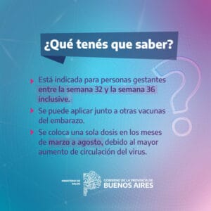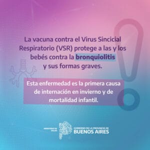 El ministerio de Salud de la Provincia de Buenos Aires convoca a las embarazadas de entre 32 y 36 semanas de gestación a vacunarse contra el Virus Sincicial Respiratorio antes del 31 de agosto, último día de este año en que se aplicará esta vacuna que previene la bronquiolitis. Con esta inmunización se protege a el o la bebé por nacer de esa infección respiratoria que constituye la primera causa de internaciones en invierno y uno de los principales motivos de mortalidad infantil.