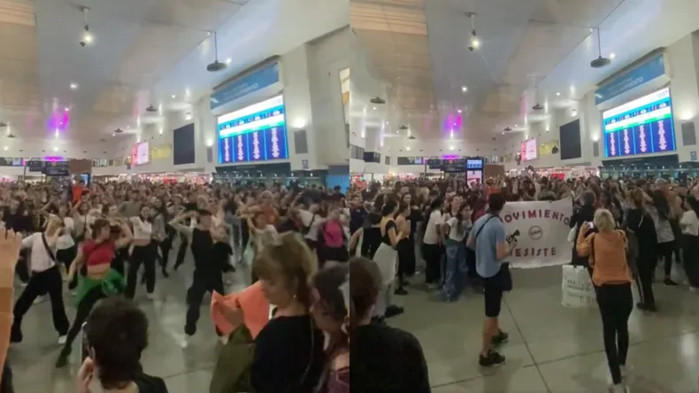 Estudiantes de la Universidad Nacional de las Artes (UNA) bailaron Fanático de Lali Espósito en el hall central de la Estación Once como forma de visibilizar las protestas contra el veto del presidente Javier Milei a la Ley de Financiamiento Universitario.