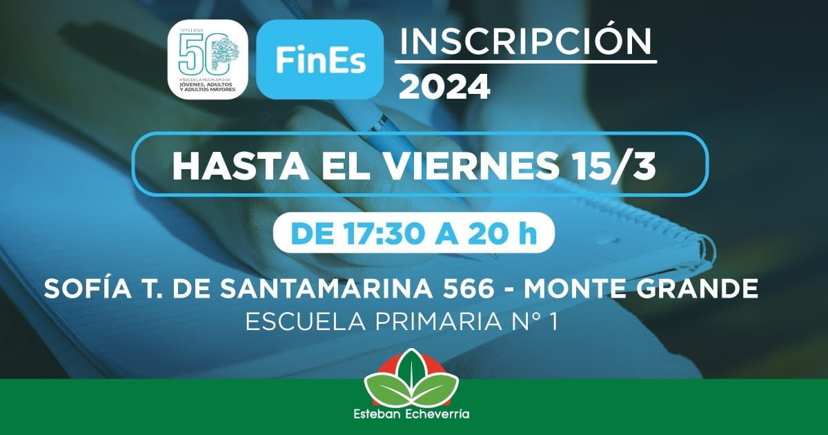 El Municipio de Esteban Echeverría extendió hasta el viernes 15 de marzo la inscripción al Plan FinEs 2024 para personas mayores de 18 años. Esta modalidad permite terminar los estudios secundarios o rendir materias adeudadas de forma presencial en sedes descentralizadas y en horarios flexibles.