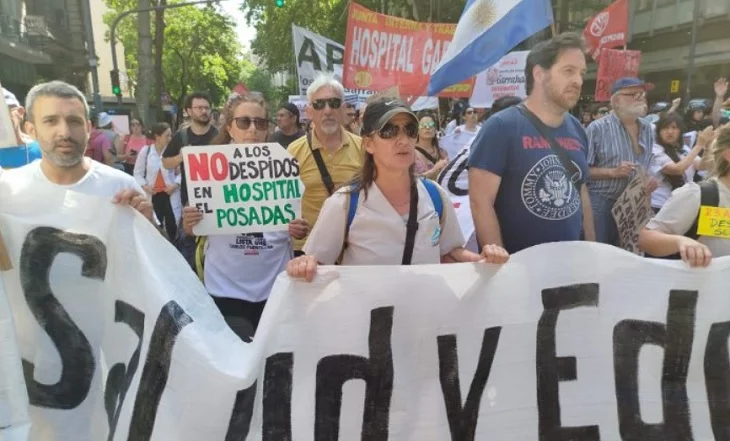 Trabajadores del Hospital Posadas se manifestaron en la Plaza de Mayo contra los despidos masivos. Recientemente, se notificaron unos 20 nuevos despidos. De la marcha participaron también médicos y residentes del Hospital Garrahan y del Bonaparte.