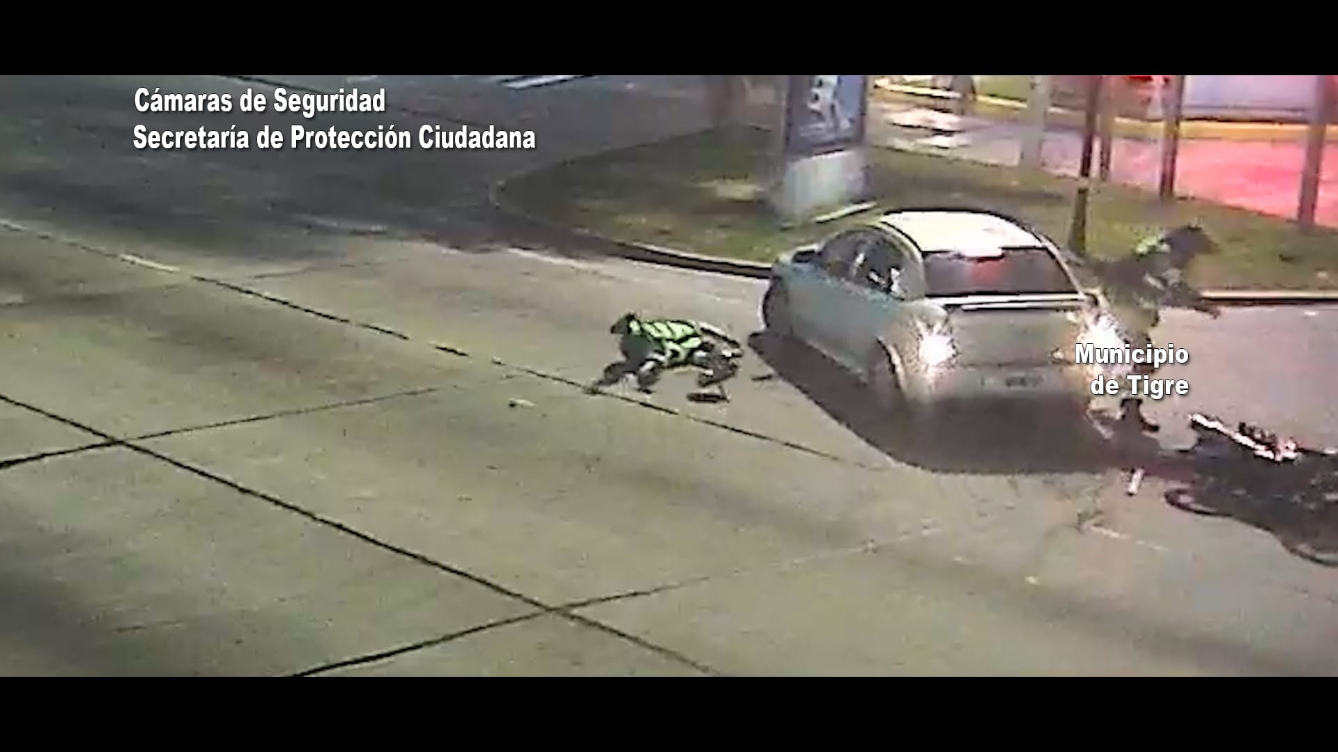 Las cámaras del Centro de Operaciones Tigre (COT) registraron un accidente vial entre un automóvil y una motocicleta en la localidad de General Pacheco. Los agentes y el personal del Sistema de Emergencias Tigre acudieron inmediatamente para asistir a los damnificados.