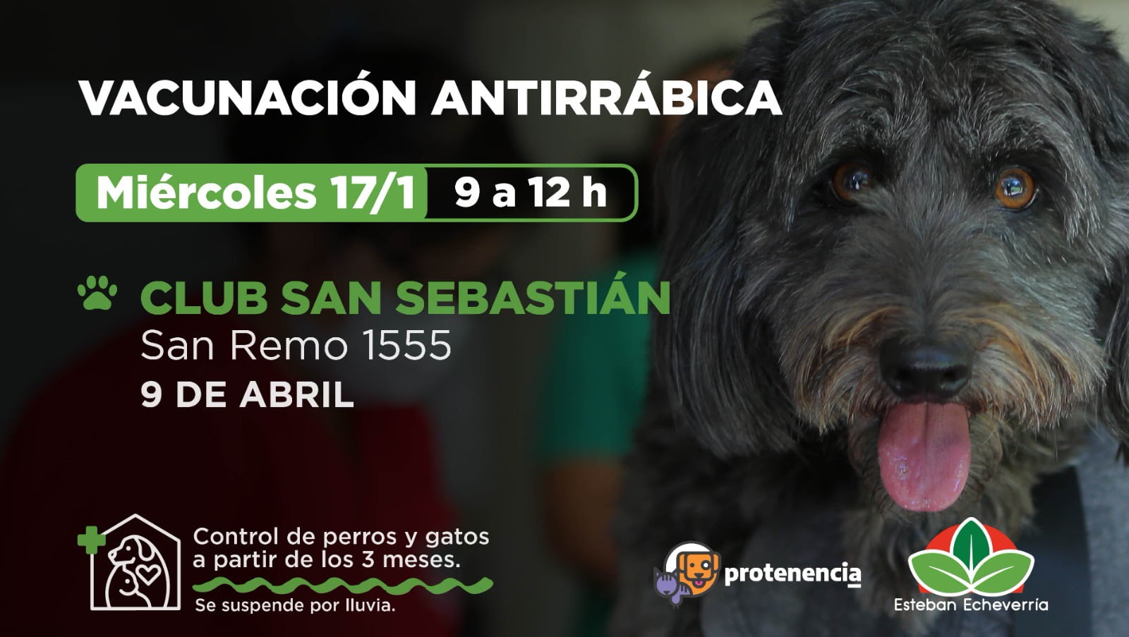 El miércoles 17 de enero, de 9 a 12 horas, el Municipio de Esteban Echeverría y el equipo del Programa Nacional Protenencia realizarán un operativo de vacunación antirrábica para perros y gatos mayores de tres meses en el Club San Sebastián, ubicado en San Remo 1555 (9 de Abril).