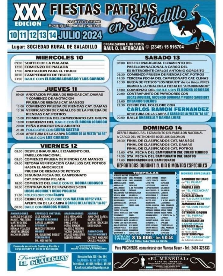 Del 10 al 14 de julio Saladillo festeja a lo grande durante 5 días la edición Nro. 30 de “Fiestas Patrias” con peñas, bailes, invitado especiales, gastronomía y un sinnúmero de actividades que mantienen viva la tradición.